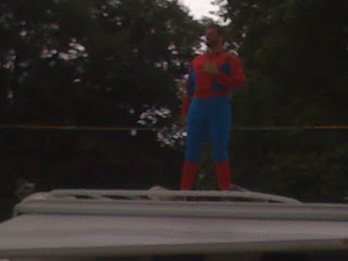Marcus Brigstoke dressed as Spiderman on top of his camper van. Paul Byrne’s quote of the moment ‘Jesus, someone give that man his kids back.’ Brilliant.