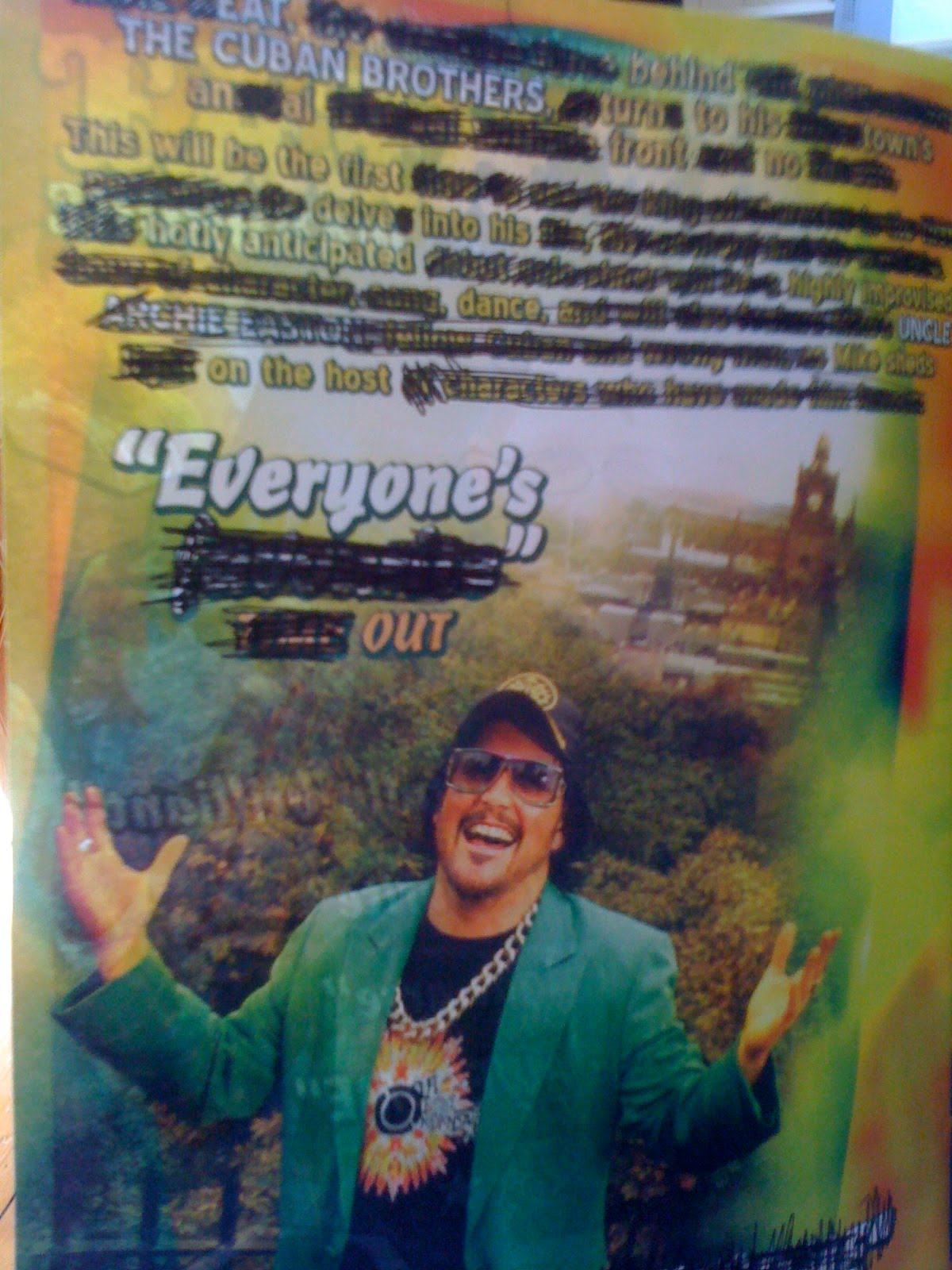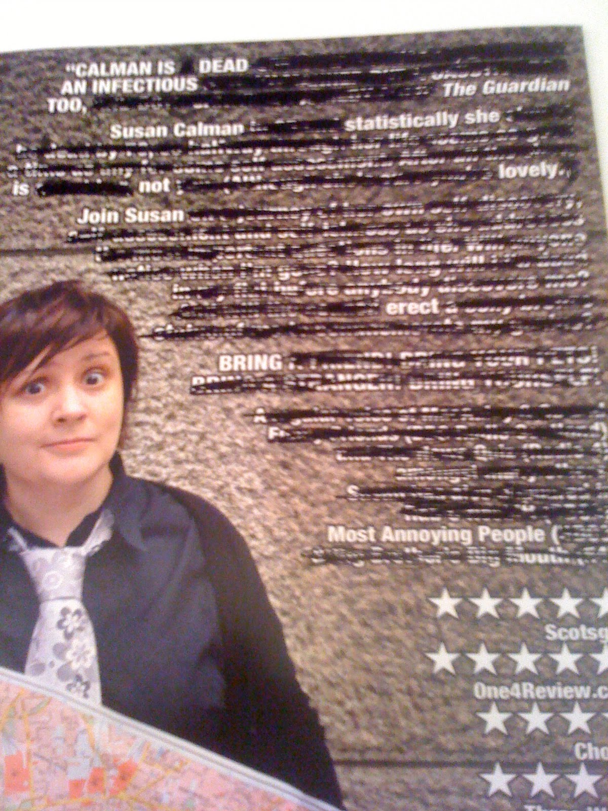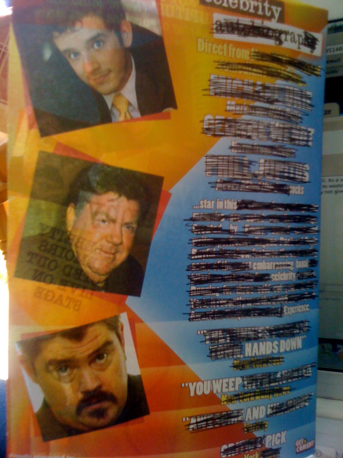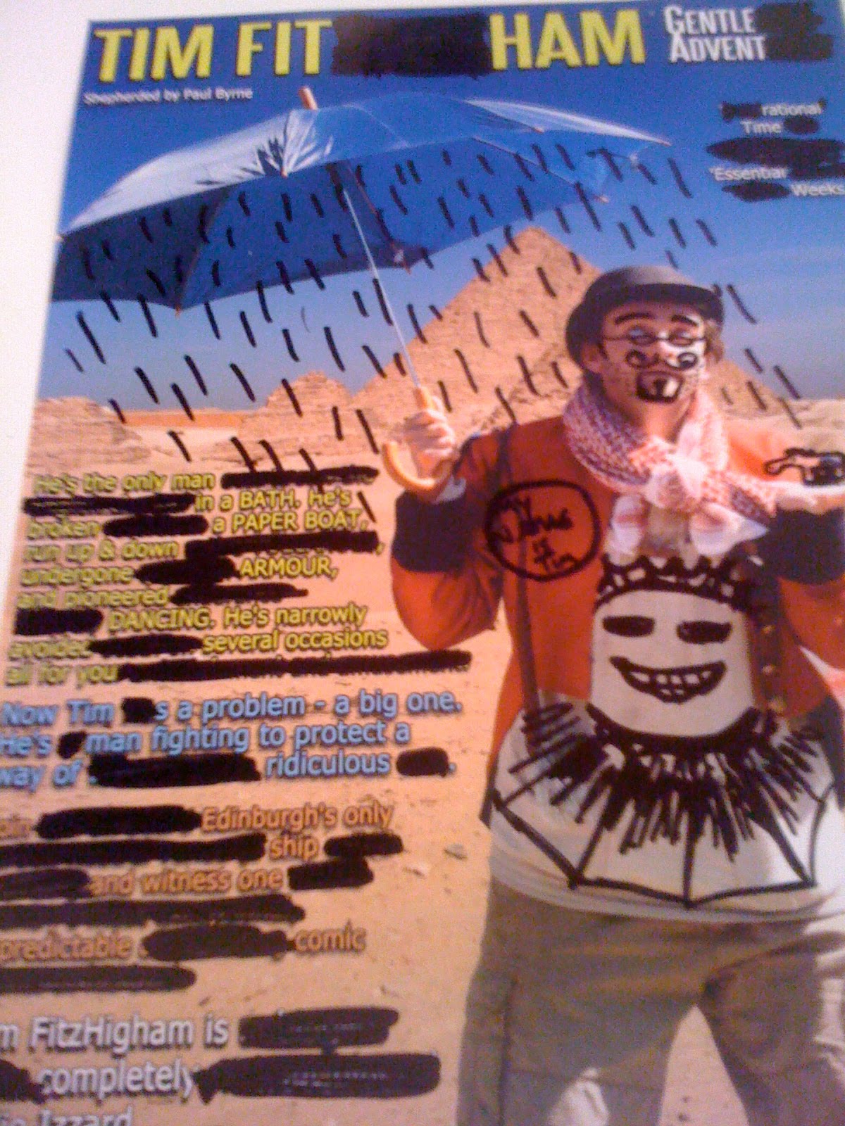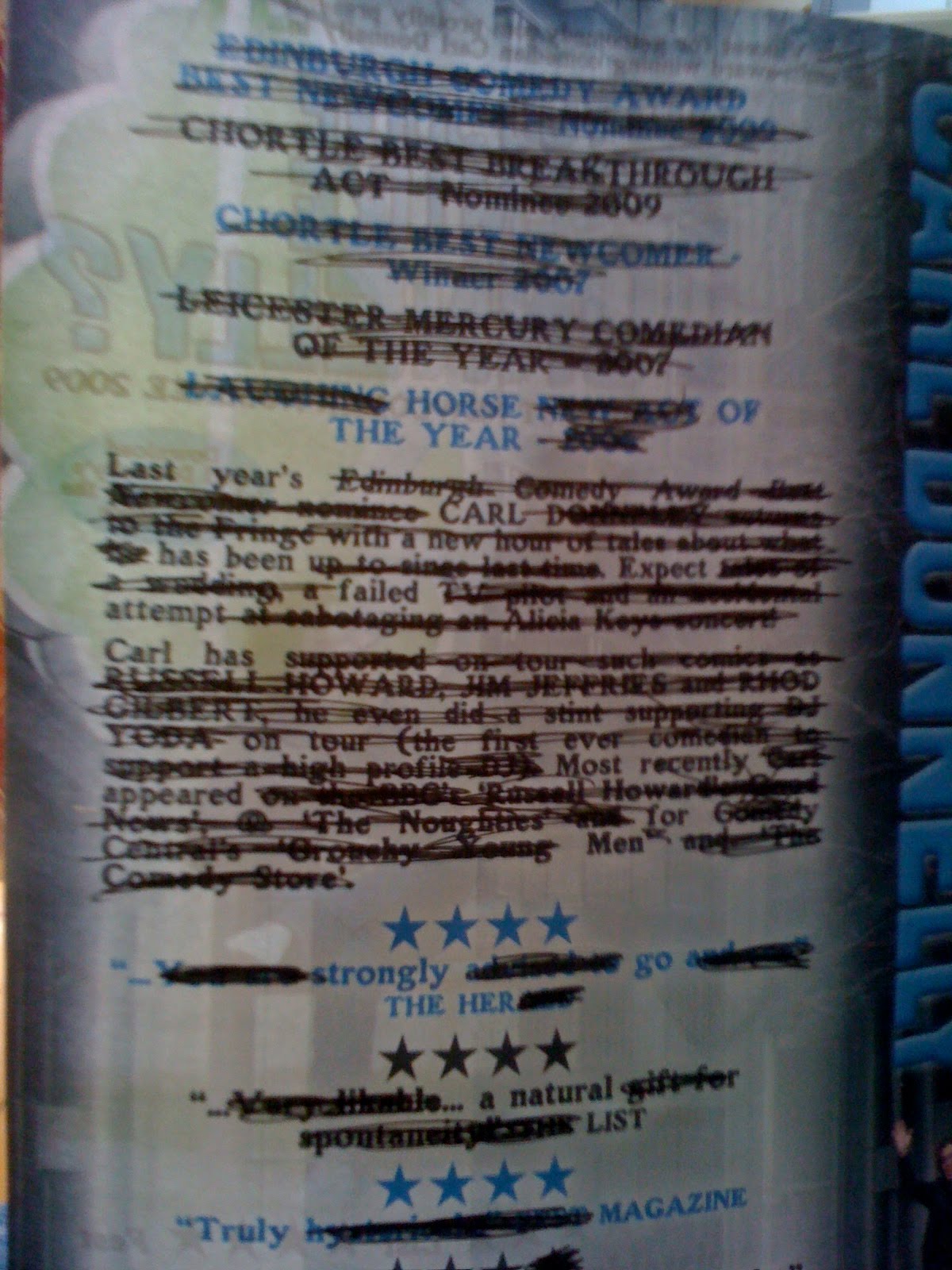 My favourite new game of the fringe is Flyer Editing, or Flyediting if you will. Its a very simple game that you can play too with any flyers any time of the year, a black marker pen and a huge amount of time to waste. Luckily at the fringe, I have all of these things and so, flyediting has been born. Here are my current attempts so far. Why not give it a go too and post your pics in the comments section?