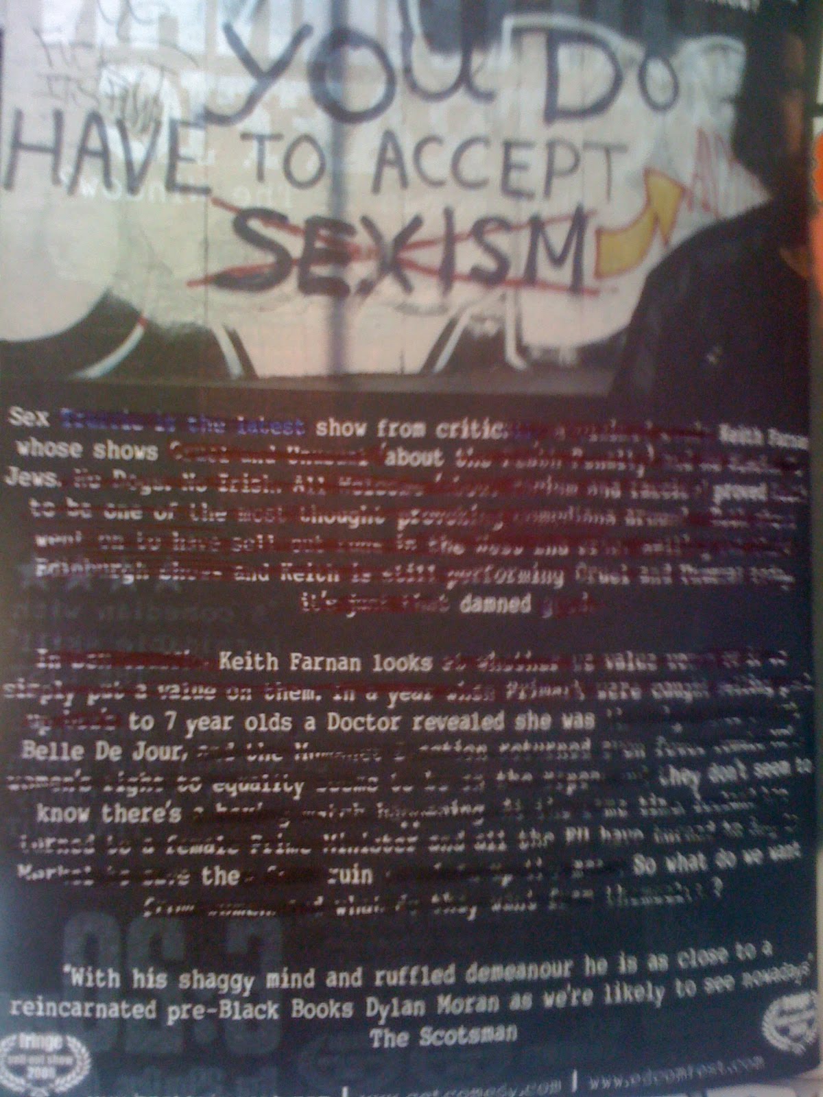 ‘Sex show from critic Keith Farnan whose shows about Jews proved damned. Keith Farnan looks to 7 year olds. A doctor revealed he was Belle Du Jour. They don’t seem to know there’s the ruin. So what do we want?’