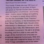 What he gains in gravitas he risks losing in comedy but—credit where it is due—he, like Josie Long, pins this squirmy proposition down as much as he can and gets the juxtaposition between heavy context and winning punchlines right when it is most needed, most notably using his mum’s take on why the recent riots calmed and how David Cameron calling the rioters “sick” would backfire on the streets.